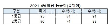 [베리타스알파=권수진 기자] 유웨이가 21일 실시한 2020 4월 모의고사 예상 등급컷을 6시5분 기준 국95점 수(가)84점 수(나)91점으로 예측했다.