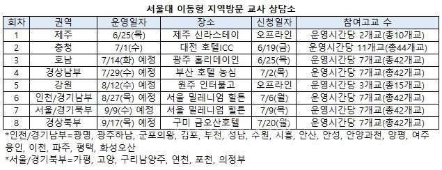 [베리타스알파=강태연 기자] 서울대가 ‘이동형 지역 방문 상담소’를 운영한다고 11일 밝혔다. 25일 제주를 시작으로 9월17일 경상북부까지 총8개 권역을 이동하며 상담소를 설치할 계획이다. 운영시간은 오전10시30분부터 오후6시까지다. 서울대 입학사정관이 참여해 고교별로 약 1시간 정도의 상담시간이 주어진다. 상담소에 마련된 접수 고교별 부스에서 매 시간대마다 동시에 상담을 진행한다. 사전질문지를 통해 받은 질문에 대한 답변/논의에 이어 입학사정관과의 질의응답시간도 갖는다. 현재 제주 25일, 충청 내달 1일 2개권역은 일정이 확정된 상태며, 나머지는 예정일이 공개됐다. 모든 일정은 신청을 해야 참여가 가능하다. 제주와 강원의 경우 오프라인 접수를 받고, 나머지는 온라인 신청일자에 맞춰 신청해야 한다, 모든 신청은 일자별 오후3시부터 가능하다. 온라인 신청은 서울대 입학 홈페이지 공지사항 공지글 내 사이트를 통한다. 신청 자격은 고교 교사로 제한한다. 학교 단위 신청만 가능하며 상담시에는 학교당 3명 이내의 교사만 참석할 수 있다.