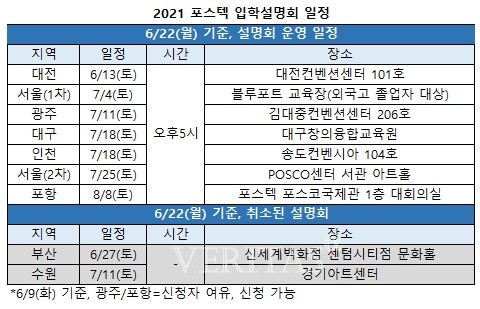 앞서 일정이 취소된 수원설명회에 이어 부산설명회가 취소되면서 현재 진행이 예정된 설명회는 총6회다. ▲서울1차 내달 4일 블루포트 교육장(외국고 졸업자 대상) ▲광주 내달 11일 김대중컨벤션센터 206호 ▲대구 내달 18일 대구창의융합교육원 ▲인천 내달 18일 송도컨벤시아 104호 ▲포항 8월8일 포스텍 포스코국제관 대회의실 순이다. 모두 오후5시부터 설명회가 시작된다. 포스텍은 8월중 온라인설명회를 실시할 예정으로, 상세내용은 추후 공지할 예정이다.