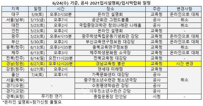 올해 코로나19 영향으로 입시설명회는 대부분 취소되거나 온라인으로 대체됐다. 앞으로 남아있는 입시설명회는 27일 실시하는 경남창원지역 설명회다. 무기한 연기된 경북포항 일정의 경우 아직 정확한 일정, 방향 등이 공지되지 않았다. 입시설명회 등에 참여를 희망하는 인원은 수시로 입학안내 홈페이지를 통해 일정을 확인할 필요가 있다.