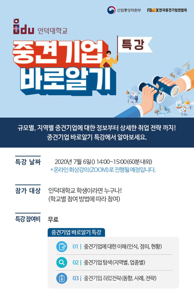한국중견기업연합회와 공동 주관한 이번 강의에서는 ‘중견기업 바로알기 특강’을 주제로 중견기업의 정의와 중견기업의 탐색방법, 서울과 경기지역 등 지역별 대표 중견기업에 대한 정보와 중견기업에 취업할 수 있는 구체적인 전략을 제시하였다.