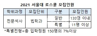 [베리타스알파=권수진 기자] 2021학년 서울대 로스쿨 원서접수가 10월5일 시작된다. 올해 역시 가군에서 150명을 선발하며 일반전형 139명이내, 특별전형 11명이상을 모집한다. 모집인원이나 전형방법이 지난해에서 큰 변화 없이 그대로 유지된다.