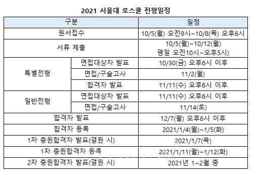 특별전형은 면접대상자를 10월30일 오후6시 이후 로스쿨 홈페이지를 통해 발표한다. 면접및구술고사는 11월2일 실시한다. 합격자는 11월11일 오후6시 이후 발표한다.