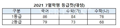 [베리타스알파=권수진 기자] 대성이 발표한 7시16분 기준 2020 7월 모의고사 예상 1등급컷은 국86점 수(가)84점 수(나)76점이다.