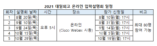 [베리타스알파=박동주 기자] 대일외고가 8월부터 총 7회에 걸쳐 온라인/오프라인 입학설명회를 진행한다. 온라인 입학설명회는 20일을 시작으로, 9월 10일 24일, 10월 15일 29에 진행된다. 화상회의 플랫폼인 Cisco Webex를 통해 오후 5시에 진행되며 최대 80명이 참가할 수 있다. 오프라인 입학설명회는 내달 19일, 11월 14일에 열리며 오전 10시에 진행된다. 내달 19일에 열리는 설명회 장소는 대일외고 어학관 5층 다산홀에서 열리며 150명까지 참석 가능하다. 11월 설명회 장소는 최대 2000명까지 수용 가능하며 추후 공지할 예정이다.