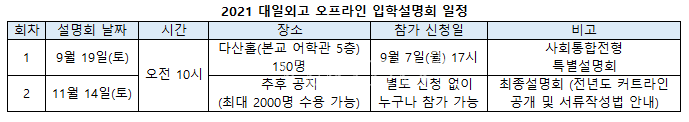 설명회에선 대일외고의 교육과정 및 학교생활과 자기주도학습전형, 즉 전형 절차 및 자소서 작성법 등을 안내한다. 기숙사 투어는 토요일 오전만 가능하며 온라인 입학설명회 같은 경우에는 진행하지 않는다. 특히 내달 19일 예정된 오프라인 설명회에선 사회통합전형 특별설명한다. 11월 14일에 계획된 오프라인 설명회는 최종설명회로, 전년도 커트라인을 공개하고 서류작성법을 안내한다. 특히 오프라인 입학설명회 참가 인원 및 진행 여부는 코로나19로 인한 사회적 거리두기로 달라질 수 있다.