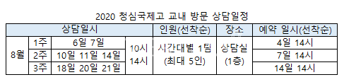 청심국제고는 지난달 이미 코로나19 감염확산방지 차원에서 교내 입학설명회 대신 소규모 방문 상담을 시행했다. 이달 교내 방문 상담은 추가 일정에 관한 많은 문의와 요청때문에 다시 한 번 시행하는 것이다. 추가 상담 시행에도 교내에 직접 방문하기 어렵다면 이달 10일~14일 사이에 예정된 온라인 입학설명회에 참석하면 된다. 온라인 입학설명회에서는 청심국제고뿐 아니라 청심국제중에 관한 내용도 다뤄진다. 학교소개와 2021학년도 입학전형 안내, 생활관 소개 등이 이뤄진다. 설명회는 홈페이지 공지사항을 통해 유튜브 링크로 접속하면 참여할 수 있다.