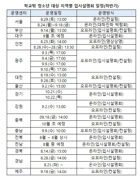 지역별로 열리는 하반기 대입설명회는 지역별로 운영방식이 다르기 때문에 운영내용을 확인해야 한다. 서울 전북 등은 화상통화 앱 등을 활용해 온라인 일대일 맞춤형 입시상담을 운영한다. 개인의 검정고시 성적, 진로심리검사결과 등을 바탕으로 심층적이고 구체적인 입시정보 및 진로계획을 세울 수 있도록 지원한다. 서울은 온라인대학진학박람회 형식으로 진행해 온라인으로 신청/참여할 수 있다.