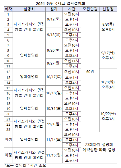 신청은 회차마다 지정된 신청기간을 지켜 온라인 신청을 해야 한다. 동탄국제고 누리집-입학안내-입학설명회 안내 및 접수-입학설명회 참가 신청 게시판 속 '신청하기' 버튼을 눌러 신청하면 된다. 설명회는 휴대전화로는 할 수 없고 PC로 온라인 예약만 가능하며 전화예약은 불가하다. 현장 접수도 받지 않는다. 23회까지의 예약 상황에 따라 11월 14일과 15일 추가로 설명회를 6회 더 열 수도 있다.