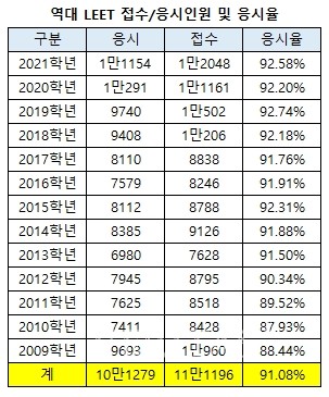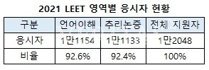 [베리타스알파=강태연 기자] 2021 LEET 채점 결과가 공개되면서 2021로스쿨 입시가 본격적으로 개막한다. 법학전문대학원협의회(로스쿨협의회)는 지난달 19일 실시한 2021 법학적성시험(LEET) 채점결과를 18일 공개했다. 지난해에 이어 올해도 법학계열 인원이 줄면서 사회계열 응시자가 법학계열 응시자를 넘어섰다. 법학계열 응시자 감소는 로스쿨 보유대학의 법대폐지로 인해 법대출신이 줄어든 영향이다. 반면 다른 계열에서는 취업난이 장기화되면서 대학 졸업자, 졸업예정자들은 전문직인 법조인을 선호하는 경향이 상승했다. 법학계열 응시자 비율은 2013학년 최고치를 기록하고 매년 하락하고 있는 반면, LEET 최근 응시인원은 3년연속 역대 최다를 기록하고 있다. 올해 지원자 1만2048명 가운데 언어이해영역은 1만1154명(92.6%), 추리논증영역은 1만1133명(92.4%)이 응시했다.