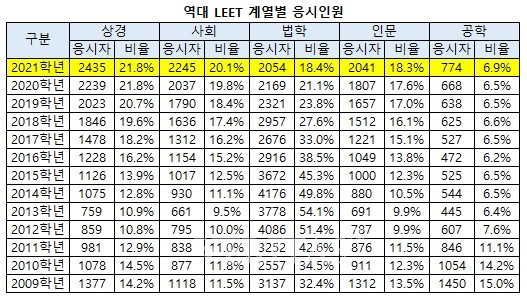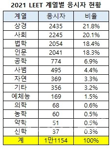 올해도 응시자 가운데 상경계열이 가장 많았다. 지난해 처음으로 상경계열이 법학계열을 제치고 상경계열이 올해도 최대 비중을 차지했다. 지난해와 비교해 196명이 늘었지만 응시자 비율 자체가 늘어나 비중은 21.8%를 유지했다. 지난해 상경계열에게 밀려 두 번째로 비중이 컸던 법학계열의 경우 올해는 사회계열에 밀려 세 번째였다. 사회계열은 2245명(20.1%)로 지난해보다 208명(0.3%) 늘었다. 이어 법학계열(2054명)(18.4%) 인문계열(2041명)(18.3%) 공학계열(774명)(6.9%) 사범계열(495명)(4.4%) 자연계열(369명)(3.3%) 기타계열(356명)(3.2%) 예체능계열(169명)(1.5%) 의학계열(68명)(0.6%) 농학계열(60명)(0.5%) 약학계열(51명)(0.5%) 신학계열(37명)(0.3%) 순이다.