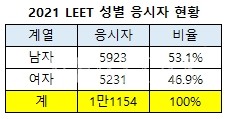 성별로는 올해도 남성의 응시비율이 더 높았다. 남자5923명(53.1%), 여자5231명(46.9%)의 비중이다. 지난해 남자5653명(54.9%), 여자4638명(45.1)였던 것과 비교하면 격차는 줄었다.