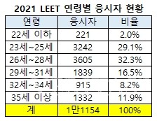 연령별로는 26세이상 28세이하가 3605명(32.3%)으로 가장 많았다. 23세~25세3242명(29.1%) 29세~31세1839명(16.5%) 35세 이상1332명(11.9%) 32세~34세915명(8.2%) 22세 이하221명(2%) 순이다.