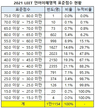 언어이해영역 표준점수는 10이상 80미만 구간에 분포했고, 가장 많은 응시자가 분포한 구간은 35이상 40미만으로 2355명(21.1%)이 몰려있었다. 지난해 표준점수는 5이상 75미만 구간에 분포한 반면 올해 표준점수 구간이 오른 특징이다.