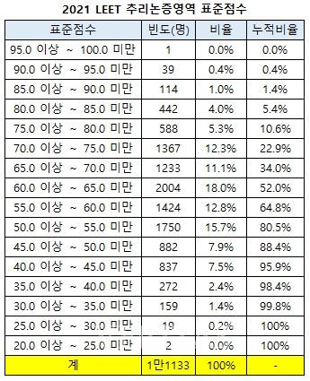 추리논증영역의 경우 20이상 100미만 구간에 분포했다. 60이상 65미만에 가장 많은 인원이 몰려 2004명(18.0%)이 속했다. 추리논증영역도 지난해 표준점수가 10이상 95미만 구간에 분포했지만, 올해 구간이 상승했다.