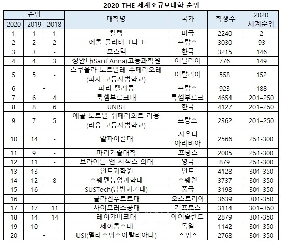 포스텍은 2020 THE 세계 소규모대학순위에서 세계3위에 올랐다. 포스텍 뒤를 이어 세계톱20 내에 자리한 아시아대학은 8위를 기록한 UNIST로 격차가 제법 컸다. 이어 13위 인도과학원(인도) 15위 SUSTech(남방과기대)(중국) 순이다. 지난해 20위를 기록했던 사반치대는 27위로 하락했다. 국내대학은 포스텍과 UNIST만이 순위에 올랐다. UNIST는 2018순위에서부터 순위권에 이름을 올렸다. 2018년 6위에서 2019년 8위로 내려가고, 2020순위에서도 8위를 기록했다.