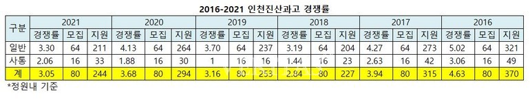 일반은 64명 모집에 211명이 지원했다. 최종경쟁률 3.3대1이다. 2020학년 4.13대1의 경쟁률에 비해 하락한 결과다. 학령인구가 급격하게 감소하기 전인 2016학년 인천진산 일반 경쟁률은 무려 5.02대1에 달했다. 2017 4.27대1, 2018 3.19대1로 하락했다. 2019학년에는 3.7대1의 경쟁률을 기록해 3년 만에 반등했고, 지난해는 다시 4대1의 기록으로 상승세를 이어갔지만 올해 다소 하락한 모습이다.