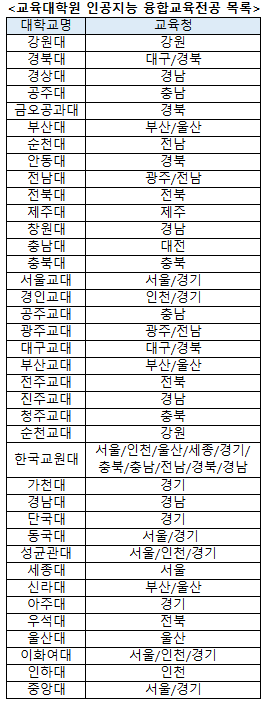 시도교육청별 교육 인원수는 서울161명 부산56명 대구53명 인천80명 광주42명 대전30명 울산36명 세종20명 경기128명 강원30명 충북99명 충남83명 전북42명 전남50명 경북49명 경남97명 제주10명이다. 교육대학원 인공지능 융합교육 전공은 강원대 경북대 경상대 공주대 금오공과대 부산대 순천대 안동대 전남대 전북대 제주대 창원대 충남대 충북대 서울교대 경인교대 공주교대 광주교대 대구교대 부산교대 전주교대 진주교대 청주교대 춘천교대 한국교원대 가천대 경남대 단국대 동국대 성균관대 세종대 신라대 아주대 우석대 울산대 이화여대 인하대 중앙대 모두 38개 교육대학원에서 교육한다.
