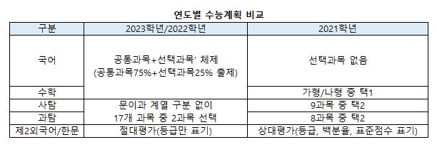 26일 발표된 2023학년 수능 기본계획은 2018년 8월 발표된 '2022학년도 대학입학제도 개편방안'에 따른 수능 체제가 적용된다. 주목할 부분은 2022학년 수능이 여러 측면에서 전보다 변화가 크다는 점이다. 현재 고2가 치르는 2022학년 수능부터는 새 교육과정을 따라 문이과 구분이 폐지된다. 2022학년 수능 전에는 문과는 사탐 과목만, 이과는 과탐 과목만 응시할 수 있었다. 2022학년부터 사탐과 과탐은 계열 구분 없이 최대 2개 과목을 선택해 볼 수 있게 됐다.