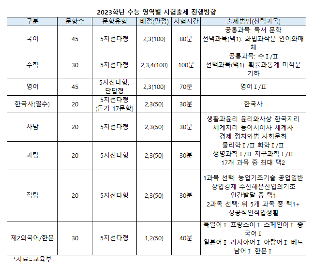 2023학년 수능 기본계획을 보면 국어 출제범위는 공통과목이 독서와 문학, 선택과목은 화법과작문/언어와매체 중 택1이라고 나와 있다. 출제과목을 바탕으로 다양한 소재의 지문과 자료를 활용해 출제한다. 수학 출제범위는 공통과목이 수Ⅰ과 수Ⅱ, 선택과목은 확률과통계/미적분/기하 중 택 1이다. 영어는 영어Ⅰ과 영어Ⅱ를 바탕으로 국어와 같이 다양한 소재를 다룬 지문과 자료를 활용해 문제를 낸다. 필수인 한국사는 우리 역사에 대한 기본 소양을 평가하기 위한 핵심 내용 중심으로 출제한다.