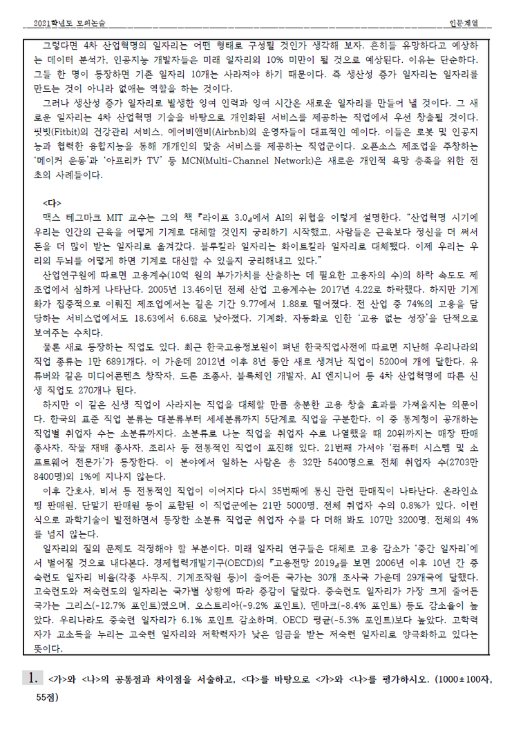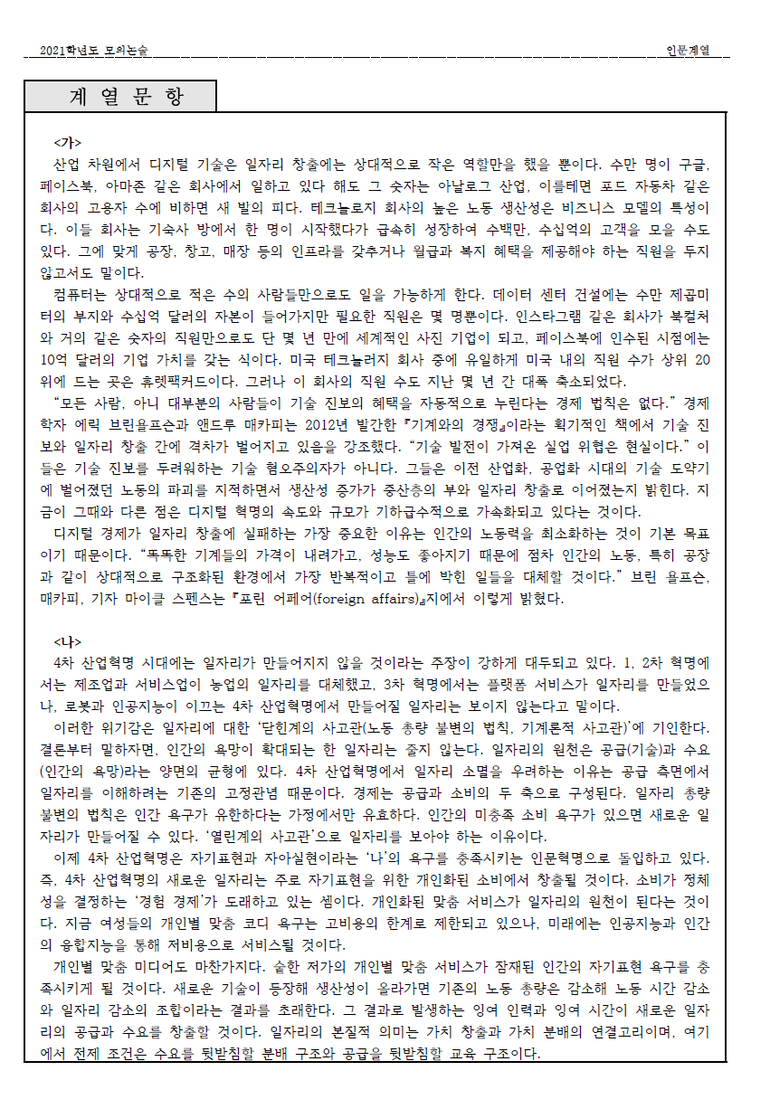 제시문<가>는 디지털 산업의 가속화에 따른 일자리 창출에 대해 부정적인 입장을 취한다. 제시문<나>는 디지털 산업이 가져올 긍정적 변화를 주장하는데 반해 제시문<다>는 부정적으로 전망하고 있다. 디지털 기반 산업으로의 가속화가 이루어지는 산업, 경제구조가 일자리 창출에 미치는 영향에 대해 핵심논지 파악을 통해 주장의 의미를 이해하고, 각 지문간 연결점을 평가하기 위해 출제했다.