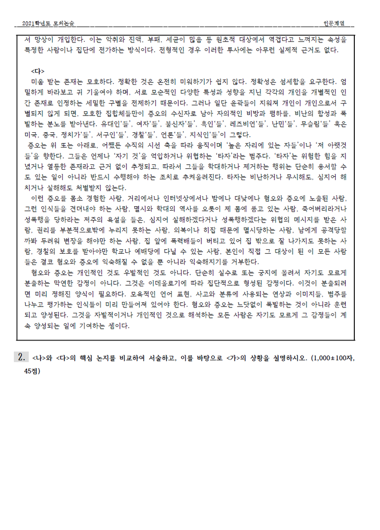 학교가 내놓은 총평에 따르면 모의논술에 참가한 학생들은 문항2에 대한 독해방법, 분석방법, 답안작성 면에서 아쉬운 면을 보였다. 고득점을 위해서는 네가지 사항을 개선할 필요가 있다. 우선 제시문에 대한 '체계적' 독해능력을 길러야 한다. 해당 과정이 없으면 글의 핵심을 파악하지 못해 맥락 없이 제시문을 그대로 인용해 답안을 작성하게 된다. 특정 단어에만 치중해 정반대의 내용을 쓰게 될 수도 있다. 출제자의 발문(질문)은 충분히 이해해야 한다. 수험생의 사유와 답안작성에 도움을 주기 때문이다. '인문2번' 문항의 첫 번째 부분은 비교문제이므로 비교의 범주를 먼저 분석해야 한다. 제시문을 따로 요약하는 것보다 중요한 과정이다. '인문2번'의 두 번째 두번째 부분은 적용문제다. 앞서 했던 비교분석틀을 활용해 종합적으로 적용해야 한다. 제시문을 별도로 적용하는 문제가 아니라는 것이다.