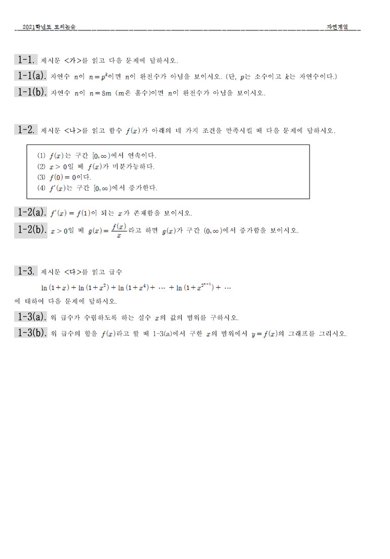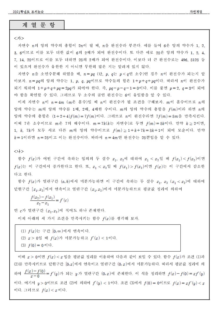 총평에 따르면 제시문 <가>는 완전수를 정의하고 어떤 자연수가 완전수가 될 조건을 구하는 방법을 소개한다. <논제 1-1(a), 1-1(b)>은 제시문 <가>에서 소개된 증명 방법에 관한 이해를 바탕으로 한다. 다른 형태의 자연수가 완전수가 될 수 없음을 증명할 수 있는지를 평가하는 문제다. 대부분의 학생들은 제시문 <가>의 핵심 내용을 정확하게 파악하고 논의된 과정을 문제에 적용하여 문제를 잘 해결했다.