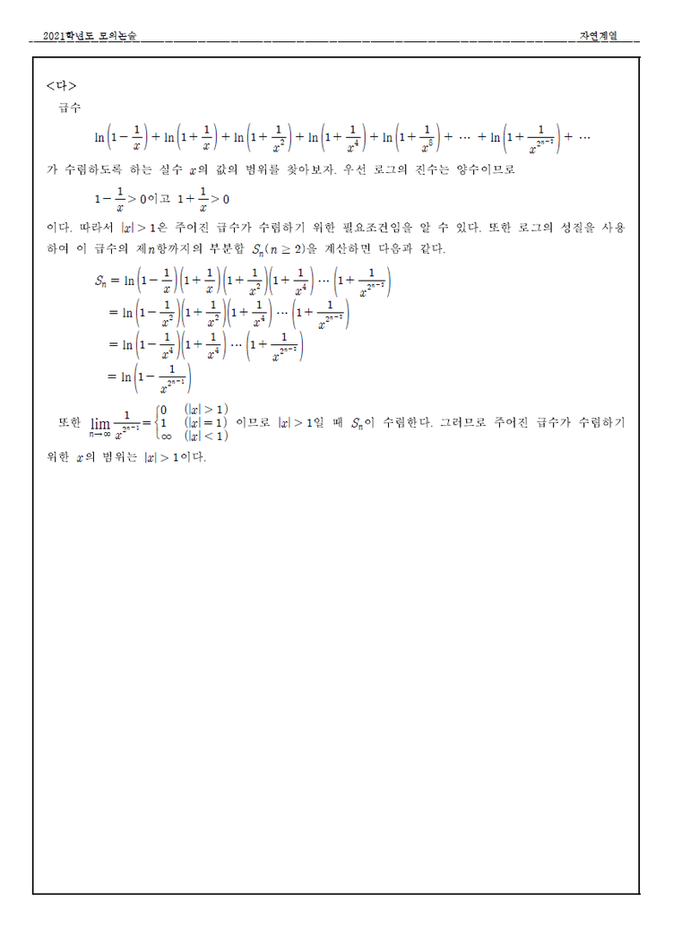제시문 <다>에서는 급수가 수렴하기 위한 조건을 로그의 성질을 사용해 구한다. <논제 1-3(a)>에서는 제시문 <다>의 내용을 바르게 이해했는지 평가하기 위해, 같은 상황에서 로그의 성질 및 등비급수의 수렴을 이용해 제시된 급수가 수렴하기 위한 조건을 구할 수 있는지 평가한다. <논제 1-3(b)>에서는 급수로 정의된 함수의 그래프를 주어진 범위 안에서 바르게 그릴 수 있는지 평가한다.