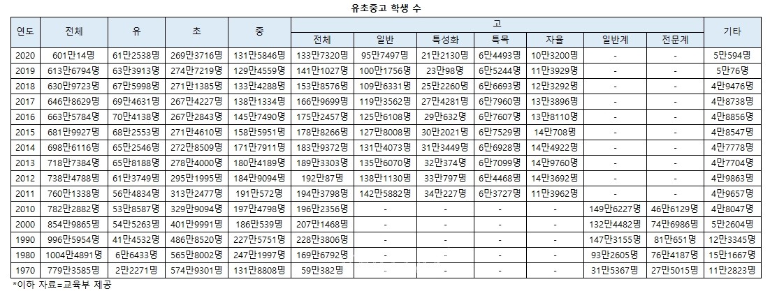 특히 고등학생의 감소폭이 5.2%로 가장 컸다. 133만7320명으로 전년보다 7만3707명 줄었다. 교육부와 한국교육개발원은 이 같은 내용을 담은 전국 유초중등/고등교육기관의 학교 학생 교원현황 등을 조사한 ‘2020년 교육기본통계’ 조사결과를 27일 발표했다. 교육부와 한국교육개발원은 매년 전국 교육기관과 관련된 교육분야 기본사항을 조사해 발표하고 있다.