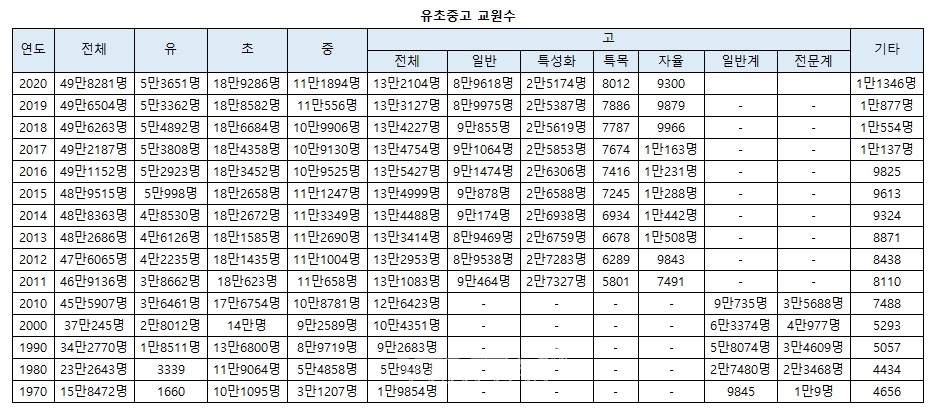 교원수는 소폭 늘었다. 유초중등 교원수는 49만8281명으로 전년49만6504명보다 1777명(0.4%) 늘었다. 학교급별로 보면 고교에서는 감소했다. 13만2104명으로 1023명(0.8%) 줄었다.