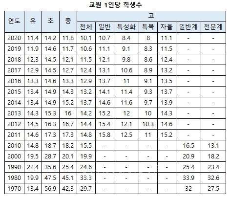 교원수가 늘고 학생수는 줄어들면서 교원1인당 학생수도 감소하는 추세다. 중학교에서만 0.1명 증가해 11.8명이다. 유11.4명 초14.2명 고10.1명으로 전년보다 각 0.5명 0.4명 0.5명 줄었다. 교원은 정규교원(교장 교감 수석교사 보직교사 교사 특수교사 전문상담/사서/실기/보건/영양교사)과 기간제 교원을 포함한다. 휴직교원도 포함하며 강사/퇴직교원은 제외했다.
