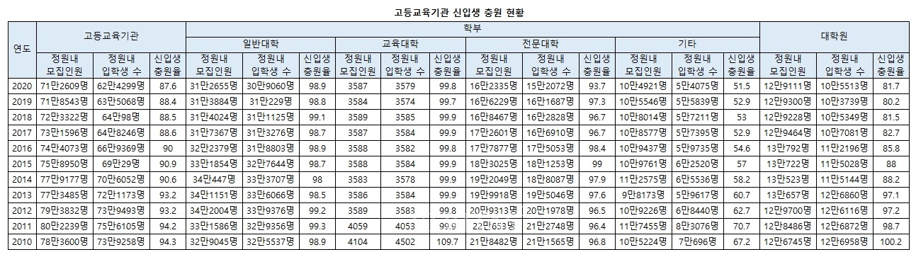 신입생 충원율은 올해도 하락했다. 87.6%로 전년보다 0.8%p 하락했다. 신입생 충원율은 정원내 입학생 수를 정원내 모집인원으로 나눠 백분율로 환산한 값이다. 전년의 경우 전문대학 신입생 충원율이 늘고 일반대에서 줄었던 반면, 올해는 일반대에서 상승하고 전문대학에서 줄었다. 일반대학 충원율은 98.9%로 전년보다 0.1% 상승했고, 전문대학은 93.7%로 3.6%p 하락했다.
