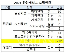 모집인원은 지난해보다 8명 늘어난 232명이다. 전형별로 ▲미래인재(전국) 60명 ▲지역인재(전남) 20명 ▲사회통합(기회균등(전국)) 12명 ▲사회통합(사회다양성(광양)) 6명 ▲사회통합(사회다양성(전국)) 5명 ▲체육특기자(전국) 13명 ▲포스코관련임직원자녀 116명이다. 지난해와 비교해 미래인재는 5명, 기회균등 1명, 포스코관련임직원자녀 4명 총 10명이 늘었다. 반면 지역인재는 2명 줄었다. 정원외에서도 변화가 있다. 지난해까지 국가유공자자녀와 고입특례 두 전형에서 6명을 선발했지만, 올해 국가유공자자녀와 고입특례 각 6명을 선발해 모집규모가 확대된다.