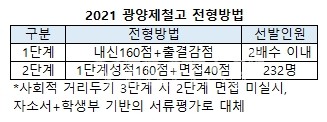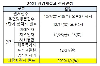 원서접수는 12월7일부터 10일 오후5시까지 실시한다. 1단계 합격자는 12월14일 오후2시 학교 홈페이지를 통해 발표할 예정이다. 면접은 12월25일부터 27일까지 진행한다. 미래인재 지역인재 사회통합은 12월25일과 26일 양일간 진행하며, 체육특기자 포스코관련임직원자녀는 27일 하루 동안 실시한다. 1,2단계 전형결과를 종합해 내년 1월4일 광철고 홈페이지를 통해 최종합격자를 발표할 계획이다.