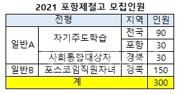포철고는 올해 정원내 신입생 300명을 모집한다. 지난해와 비교해 60명이 줄어든 수치다. 전형별로 자기주도학습(포항) 24명, 사회통합(경북) 6명, 포스코임직원자녀(경북) 30명이 줄었다. 전형별 모집인원은 일반A에서 ▲자기주도학습(전국) 90명 ▲자기주도학습(포항) 30명 ▲사회통합(경북) 30명, 일반B에서 포스코임직원자녀(경북) 150명을 모집한다. 포항/경북 지역선발을 실시하는 전형의 모집인원이 줄어든 특징이다.