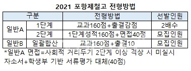 [베리타스알파=강태연 기자] 전국단위 자사고 포항제철고(이하 포철고)는 올해 정원내 신입생 300명을 모집한다. 지난해 360명 12학급을 선발했지만 올해 300명 10학급을 선발하는 변화다. 전형별로 일반A에서는 자기주도학습(포항) 24명과 사회통합(경북) 6명 총30명, 일반B 포스코임직원자녀(경북)에서는 30명이 줄었다. 전국 모집을 실시하는 자기주도학습(전국) 전형만 전년과 동일한 모집인원을 유지한다. 전형방법에서는 불참 시 탈락하는 포스코임직원자녀 면접이 삭제된 특징이다. 나머지 전형은 지난해와 동일하다. 자기주도학습은 2단계, 포스코임직원자녀는 일괄합산 방식이다. 자기주도학습의 경우 1단계에서 교과성적과 출결감점을 종합해 정원의 2배수를 선발하고, 2단계에서 1단계 성적과 면접점수를 합산해 합격자를 정한다. 다만 코로나19 상황에 따라 면접을 실시하지 않을 수 있다. 사회적 거리두기 2단계 이상으로 격상 시 면접을 미실시하고 서류평가로 대체한다. 배점은 40점 동일하며 자기주도학습과정20점, 지원동기/진로계획10점, 봉사/인성영역10점이다. 올해 원서접수는 12월15일부터 17일 오후5시까지다.