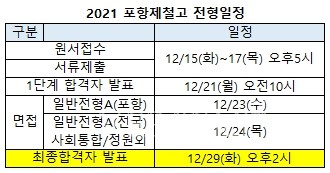 원서접수는 12월15일부터 17일 오후5시까지 실시한다. 1단계 합격자는 12월21일 오전10시 학교 홈페이지를 통해 공개한다. 단계별 전형을 실시하는 일반A만 해당한다. 면접은 12월23일과 24일 양일간 실시한다. 12월23일에는 일반전형A(포항), 24일에는 일반전형A(전국) 사회통합 전형 등이 면접을 실시한다. 최종합격자는 12월29일 오후2시 학교 홈페이지를 통해 발표할 예정이며, 학교 사정에 따라 일정이 변경될 수 있다.
