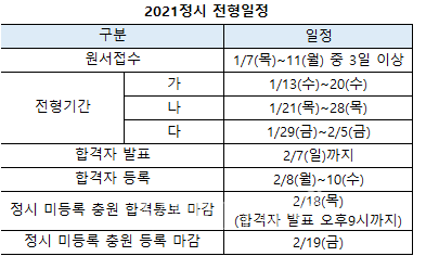 전형기간은 군별로 상이하다. 가군은 13일부터 20일까지, 나군은 21일부터 28일까지, 다군은 29일부터 2월5일까지 각 8일간이다. 합격자 발표는 2월7일까지 진행되며 합격자 등록일은 2월8일부터 10일까지다. 정시 미등록 충원 합격 통보 마감은 2월18일 오후9시까지다. 홈페이지 발표는 오후8시까지며 오후8~9시는 개별 통보만 가능하다. 정시 미등록 충원 등록 마감은 2월19일이다.