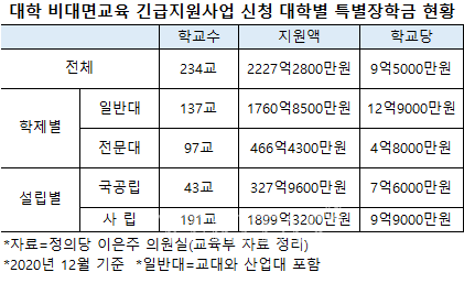 정의당 이은주 의원이 받은 교육부의 ‘대학 비대면교육 긴급지원사업 신청 대학별 특별장학금 현황’을 살펴본 결과 특별장학금 지원액은 총 2227억원이었다. 일반대가 1761억원, 전문대가 466억원이다. 설립별로는 국공립대가 328억원, 사립대가 1899억원이었다.