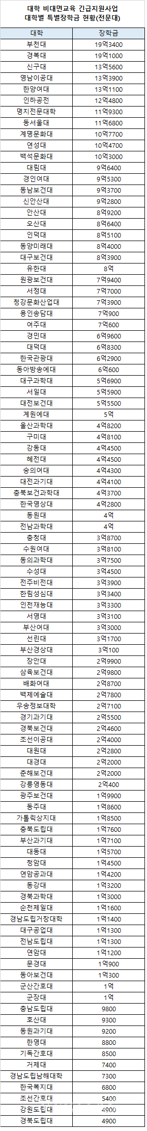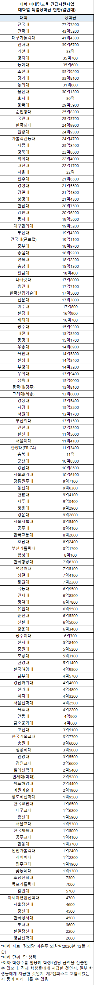 특별장학금은 지난해 2020년 3회 추경의 ‘대학 비대면교육 긴급지원사업’과 관련 있다. 금액은 대학이 제출한 사업계획서의 지원액에 대해 10월과 12월의 두 차례 교육부 점검을 거친 결과다. 수치는 총액으로, 학생수나 지급받는 대상에 따라 학생 1인당 특별장학금의 대학별 현황은 다를 수 있다.