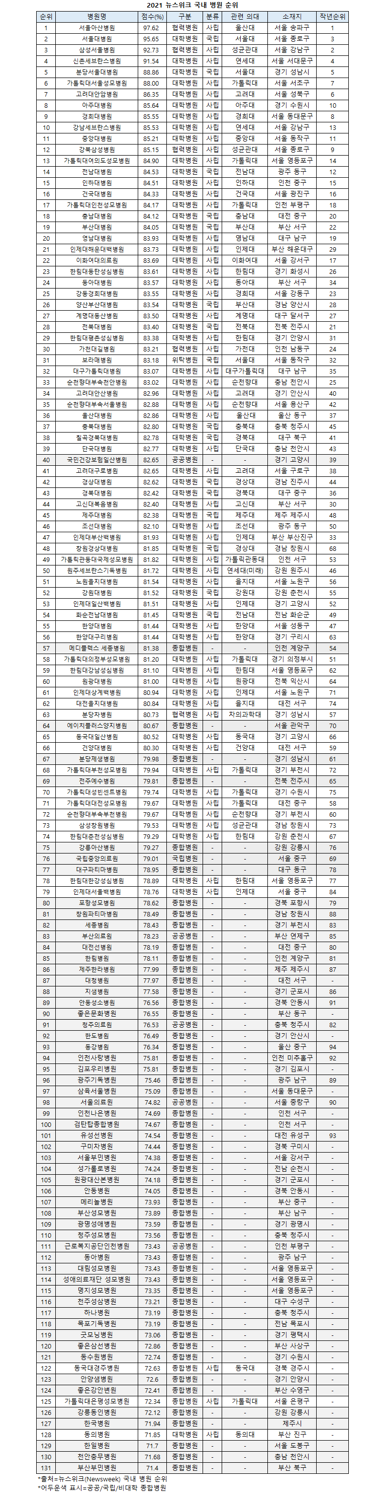순위는 뉴스위크가 독일 시장통계조사기관 스타티스타(Statista)에 의뢰해 집계한 결과다. 점수는 3개항목으로 구분해 총 100%로 산출했다. 전문가의견55%(병원소재국가50%+해외5%) 환자만족도15% 의료성과지표(KPI)30%의 반영비율이다.