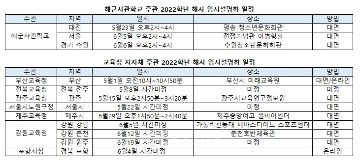 [베리타스알파=김하연 기자] 해군사관학교는 5월1일 부터 시작하는 2022학년 찾아가는 입시설명회를 해사 주관과 교육청/지자체 주관 투트랙으로 진행한다고 22일 밝혔다. 해사 주관은 5월23일부터 6월6일까지 총3회 진행한다. △대전 5월23일 오후2시~4시 △서울 6월5일 오후2시~4시 △경기수원 6월6일 오후2시~4시다. 해사 주관 입시설명회는 추후 사전 신청을 받을 예정이고 홈페이지를 통해 공지한다. 교육청/지자체 주관 설명회는 모두 9차례 열린다. 지역별로 ▲부산 5월1일 오전10시~10시50분 ▲전북 5월8일 ▲광주 5월15일 오후2시50분~3시20분 ▲서울 5월22일 ▲제주 5월29일 오후1시50분~2시40분 ▲경북포항 6월4일 ▲강원강릉 6월5일 ▲강원춘천 6월12일 ▲강원원주 6월19일이다. 교육청/지자체 주관 설명회는 사전신청을 통해 참석 가능하고, 신청방법은 해당 교육청/지자체에 문의해야 한다.