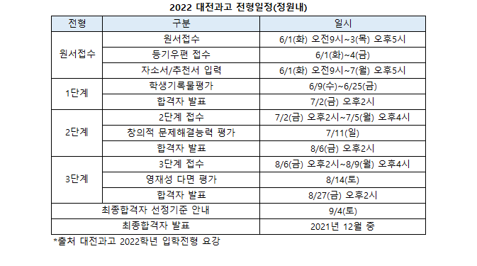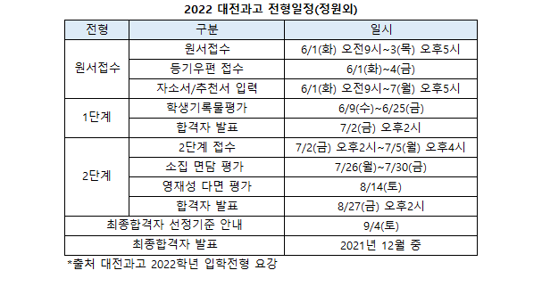 학생기록물 평가는 내달 9일부터 25일까지 실시된다. 7월2일 오후2시 대전과고 홈페이지를 통해 1단계 합격자가 발표된다. 각 전형에서 합격한 경우, 반드시 다음 단계 전형에 별도 접수를 해야 지원자격이 부여된다는 점을 유의해야 한다.