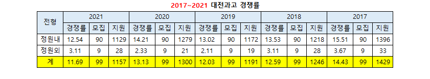 최근 7년간 대전과고의 경쟁률은 정원내 기준 2021학년 12.54대1(90명/1129명), 2020학년 14.21대1(90명/1279명), 2019학년 13.02대1(90명/1172명), 2018학년 13.53대1(90명/1218명), 2017학년 15.51대1(90명/1396명), 2016학년 17.7대1(90명/1593명), 2015학년 24.62대1(90명/2216명)의 추이다. 2014학년 과고에서 영재학교로 전환한 첫 해 모집에 20대1이 넘는 높은 경쟁률을 기록한 이후 그 다음해에도 경쟁률이 상승했다. 하지만 2015학년과 2016학년 세종영재와 인천영재가 각각 신설되면서 영재학교 문호가 넓어지고 영재성 검사일정을 통일하면서 과열된 지원양상이 안정된 모습이다. 2017년 이후 학력인구가 급격하게 줄어드는 상황에도 지난해에는 경쟁률이 상승하는 모습을 보이기도 했지만, 올해는 소폭 감소한 모습이다.