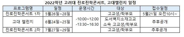 진로진학콘서트 1차는 5월26일~28일, 2차는 7월27일~29일에 열린다. 1차 신청은 5월21일 오전10시부터 홈페이지에서 선착순 접수를 받는다. 진로진학콘서트 2차 신청과 고대챌린지 신청일정은 추후 공개한다. 상담 내용은 2022학년 고려대 입학전형 안내와 2021학년 전형결과 안내 및 질의응답, 진학 및 대학생활 관련 상담 등이다. 학생부 개별 검토 및 합불여부 판단은 제공하지 않는다.