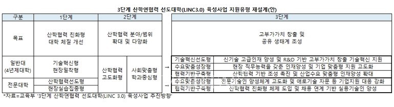 4년제대학과 전문대학에 동일한 사업유형을 적용했던 2단계와 달리, 3단계에서는 대학별 특성과 산학연협력 역량에 따라 성과를 극대화 할 수 있도록 지원한다. ‘협력기반구축형→수요맞춤성장형→기술혁신선도형’의 단계적 성장 모형을 지원유형으로 재설계한다. 일반대의 경우 기술기반 산학연협력 활동을 촉진해 고부가가치를 창출할 수 있는 기술혁신선도형을 포함하고, 전문대는 실용기술인 등 산업체 맞춤형 인재양성 체계를 고도화할 수 있도록 지원할 계획이다. 잠재역량을 갖춘 후발대학들을 대상으로도 산합협력을 추진할 수 있도록 협력기반구축형의 별도 지원유형을 신설한다.