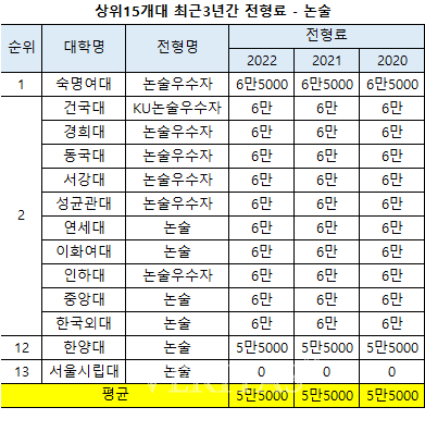 논술은 대학별 전형료가 비슷한 편이다. 지필고사 출제와 채점으로 이뤄지는 논술고사 전형과정이 대학별로 큰 차이가 없기 때문으로 분석된다.