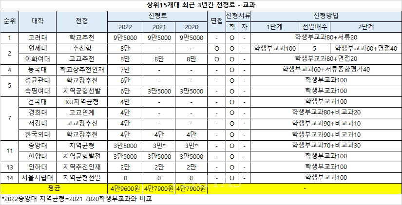 학종은 이보다 전형료가 높다. 학생부 자소서 등 제출서류를 기반으로 한 서류평가에다 면접까지 실시하기 때문이다. 같은 학종 내에서도 면접을 실시하지 않는 전형보다 면접을 실시하는 전형의 전형료가 더 비싼 편이다.