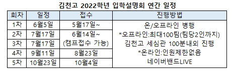 [베리타스알파=김하연 기자] 김천고는 2022학년 입학설명회 연간 일정을 최근 밝혔다. 올해 입학설명회는 6월5일부터 10월23일까지 총5회 진행한다. 일정은 △1차 6월5일 10시30분 △2차 7월17일 오전10시 △3차 7월17일 오후2시 △4차 9월11일 오전10시30분 △5차 10월23일 오전10시30분이다. 설명회는 5차까지 모두 온/오프라인 병행이다. 오프라인 설명회는 최대100팀까지 접수한다. 온라인 설명회는 인원제한 없이 네이버 밴드 라이브로 진행한다. 기숙사 및 학교 투어는 올해 코로나19로 인해 진행하지 않는다고 밝혔다.