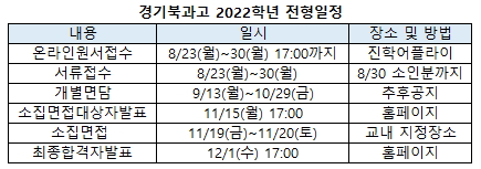 [베리타스알파=김하연 기자] 경기북과고는 2022학년 신입생 입학전형 안내 영상을 최근 공개했다. 코로나19 영향으로 인해 대면 설명회 대신 온라인으로 18분 가량의 입학전형 안내 영상을 공개한 것이다. 영상은 자기주도학습전형, 2022학년 입시요강, 사회통합전형 안내 등에 관한 내용이 담겼다. 영상은 학교 홈페이지 우측 하단을 통해 확인할 수 있다.